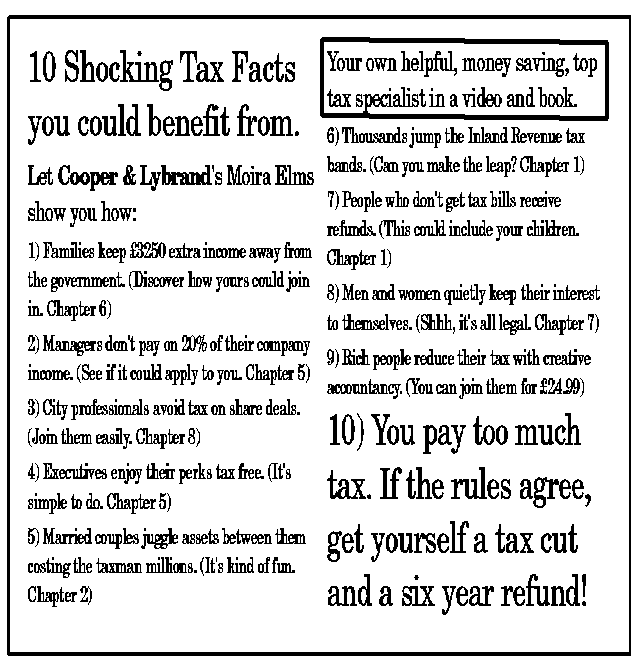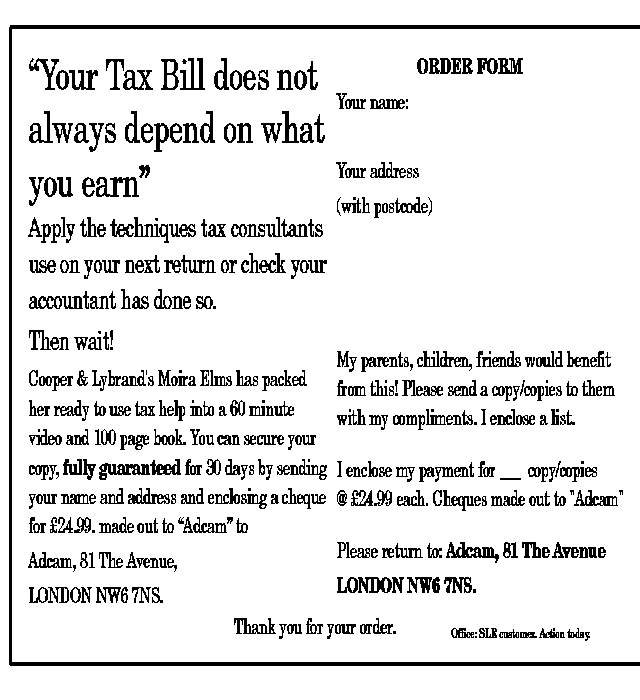 All the information is packed into a 60 minute video and 100 page book "Tax Guide 95/96", it's fully guaranteed for 30 days and available in return for a cheque for £24.99 made out to "Adcam" and your name and address sent to: Adcam, address
