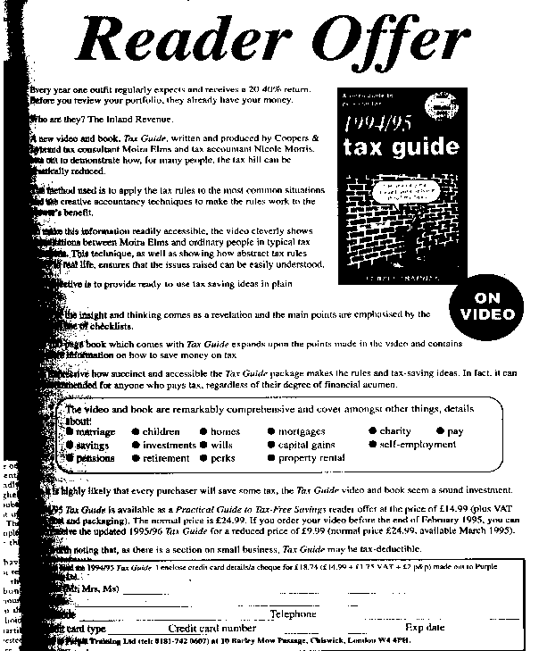 Every year one outfit regularly expects, and gets, a 20-40% return.Before you review your portfolio, they already have your money. Who are they? The Inland Revenue. A new video and book, Tax Guide, written and produced Coopers & Lybrand Tax Consultant Moira Elms & and Tax Accountant Nicky Morris, sets out to demonstrate how, for many, the tax bill can be drastically reduced. The method used is to apply the tax rules to the most common situations and use creative accountancy techniques to make the rules work to the Tax Guide purchaser's benefit. To make this information readily accessible, the video cleverly shows consultations between ordinary people in typical tax situations and Moira Elms. This technique, as well as showing how abstract tax rules apply to real life, ensures that the issues raised can be easily understood. The objective is to provide Plain English, clear ready to use, how to, tax saving ideas. Much of the insight and thinking comes as a revelation and the main points are emphasised by the frequent use of checklists. The 100 page book which comes with Tax Guide expands upon the points made in the video and contains yet more tax saving ideas. It is impressive how succinct and available the Tax Guide package makes the rules and tax saving ideas. In fact, it can be recommended for anyone who pays tax, regardless of their degree of financial acumen. The video and book are remarkably comprehensive and covers amongst other things details about marriage, children, homes, mortgages, charity, pay, perks, property rental, savings, investments, wills, capital gains, self employment, pensions and retirement. As it is highly likely that every purchaser will save some tax, the Tax Guide video and book seem a sound investment. Tax Guide is available, as a What Investment Readers offer at the price of £ from.... The producers have, helpfully pointed out that as there is a minor section on small business, Tax Guide may be tax deductible. |